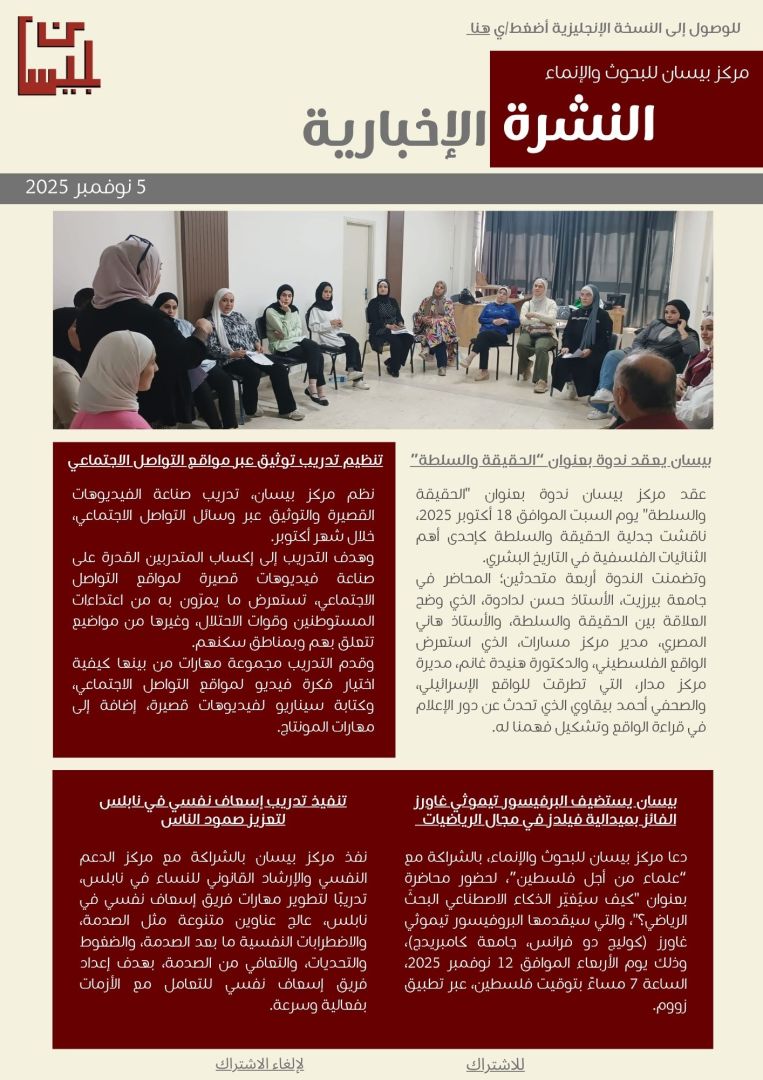 أطلق مركز بيسان للبحوث والإنماء، اليوم الأربعاء، نشرته الإخبارية التي تسلط الضوء على أبرز أحداث وأنشطة المركز خلال شهر أكتوبر الماضي.
