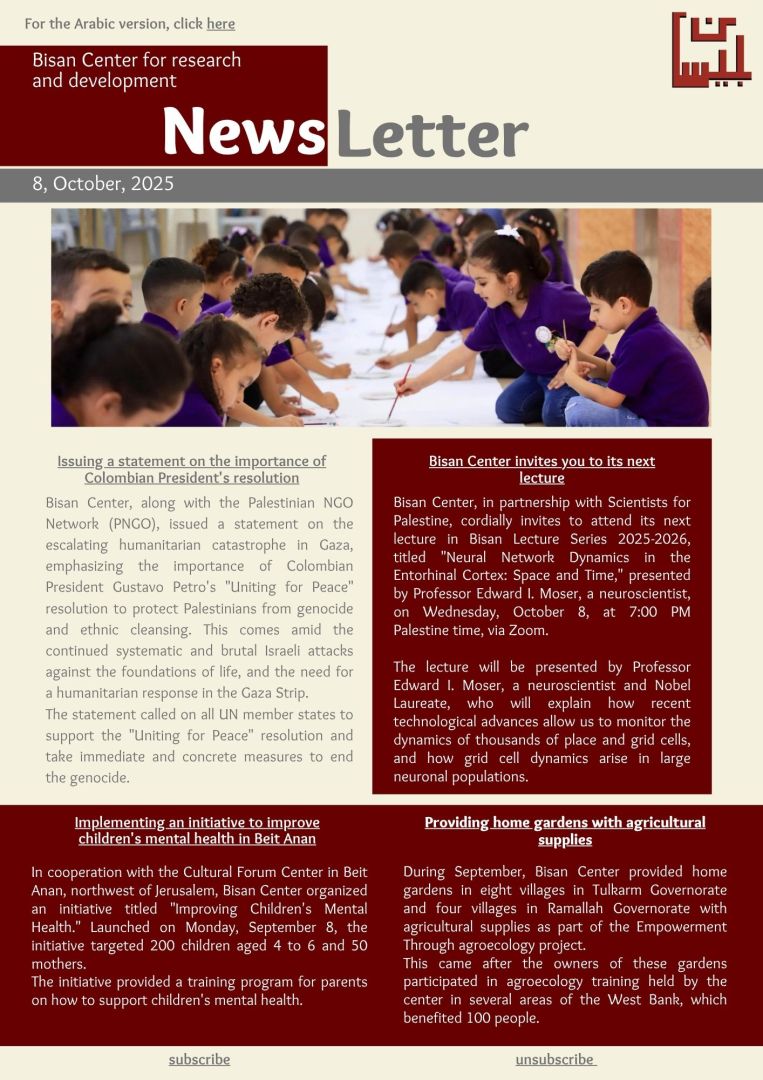 For September, Bisan Center providing home gardens in Tulkarm governorates and Ramallah governorates of agricultural supplies as part of the Empowerment Through agroecology project. The center also participated in Issuing a statement on the importance of the Colombian President's resolution "Uniting for Peace". The center supported an initiative on children's mental health in the village of Beit Anan. invited to attend its lecture as part of the Bisan Lecture Series 2025-2026.
